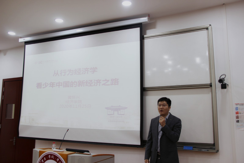 11月25日晚,由上海财经大学科研处主办,校团委、校学生会承办的上财“学者·学问·学派”论坛第四十期于国定路校区第二阶梯教室如期举行。本期论坛邀请到我校经济学院黄振兴教授,黄教授以“从行为经济学看少年中国的新经济之路”为题,从影响经济行为的非理性因素出发,论述了新经济的现状与发展趋势,新经济可能带来的陷阱以及中国目前发展新经济的优势及其未来道路。寒冷的冬雨未能阻挡同学们追求真知灼见的热情,现场座无虚席,近两百师生一同聆听了本次论坛。