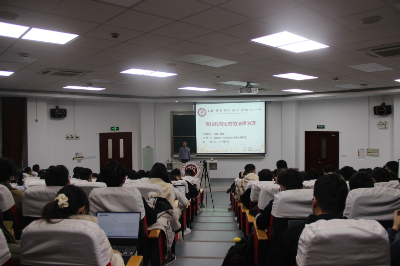 11月10日晚,上财“学者·学问·学派”论坛本学期第五讲(总第五十一期)于武东路阶梯教室如期举行。此次论坛由我校法学院徐键教授主讲。徐键教授以“高校教育惩戒的法律治理”为主题,通过未成年的教育惩戒功能引入,以对学生进行惩戒的考量因素、高校教育的惩戒界限、惩戒教育实施中的问题与对高校教育惩戒的反思为脉络,深入浅出地对高校教育惩戒的法律治理进行了剖析。现场座无虚席,近两百师生共同聆听了本次论坛。