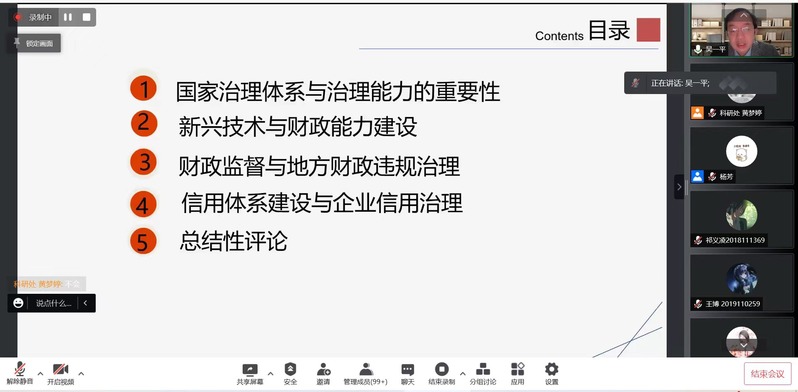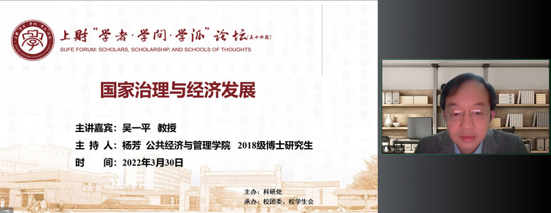 3月30日晚,上财“学者·学问·学派”论坛新学期第二讲(总第五十四期)于线上腾讯会议平台顺利举行。此次论坛由我校中国公共财政研究院吴一平教授主讲。吴一平教授以“国家治理与经济发展”为主题,结合当今世界正经历百年未有之大变局的现实背景,从国家治理体系与治理能力的重要性出发,在分析我国国家治理体系显著优势的基础上,以新兴技术与财政能力建设、财政监督与地方财政违规治理、信用体系建设与企业信用治理为脉络,从宏观和微观等多视角、多层次地剖析了国家治理体系和治理能力建设中的关键问题。现场气氛热烈,三百余位师生共同聆听了本次论坛。